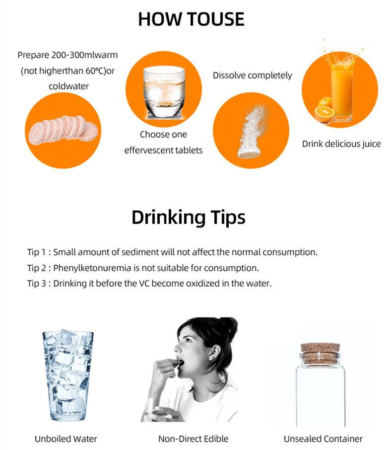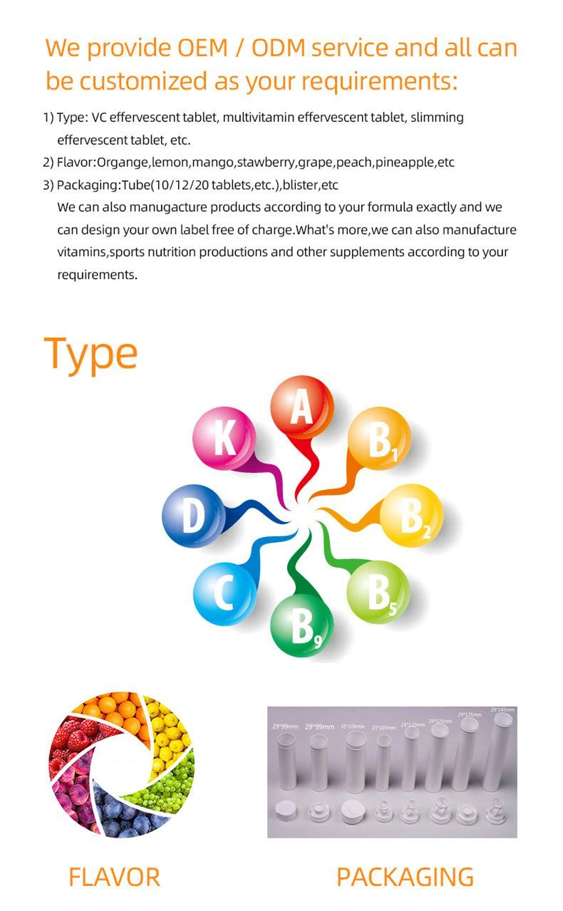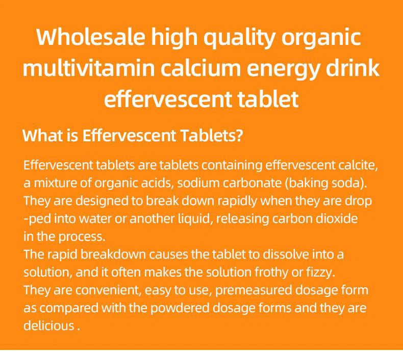 Multivitamin effervescent tablet is a high dose supplement in the form of effervescent tablets , refers to a variety of vitamins that are evenly mixed and scientifically configured according to the daily requirements of the human body, Respectively added VC, VB, VA, VD, VE, taurine, folic acid, lutein and other components as well as appropriate trace elements and minerals. Multivitamins are taken after breakfast. Research has shown that taking a multivitamin that's right for you can be beneficial to your health. For one thing, it can provide the body with a whole day's needs, so that you can devote energy to work and study, and for another, it won't put too much burden on the kidneys, Vitamin supplement is a long-term, regular process, adhere to long-term use can receive certain effects. At the same time, supplement vitamin at the same time can not ignore the role of diet, must not eat fruits and vegetables, otherwise still futile.